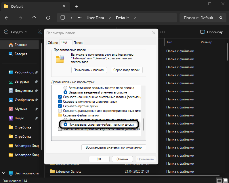 Если папка «AppData» не отображается, необходимо включить отображение скрытых файлов и папок: в Windows 11/10: нажмите на вкладку «Вид» в верхней части окна «Проводника», затем установите флажок «Скрытые элементы»; в Windows 7: нажмите Alt для отображения меню, выберите «Сервис» – «Параметры папок» – вкладка «Вид», затем выберите «Показывать скрытые файлы, папки и диски».