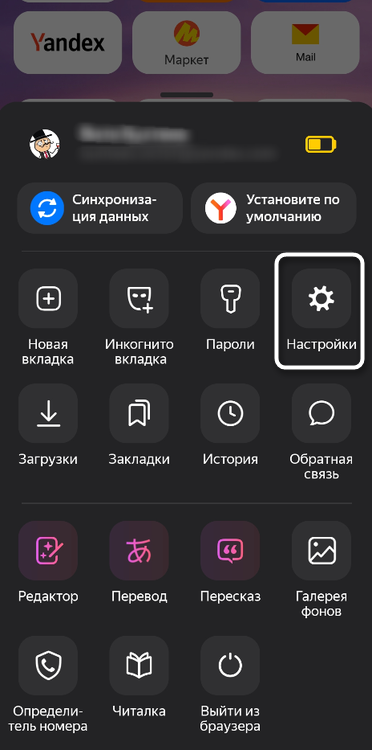 Запустите Яндекс Браузер на своем девайсе. Тапните на кнопку меню (три горизонтальные полоски) в нижней части экрана. Выберите «Настройки».