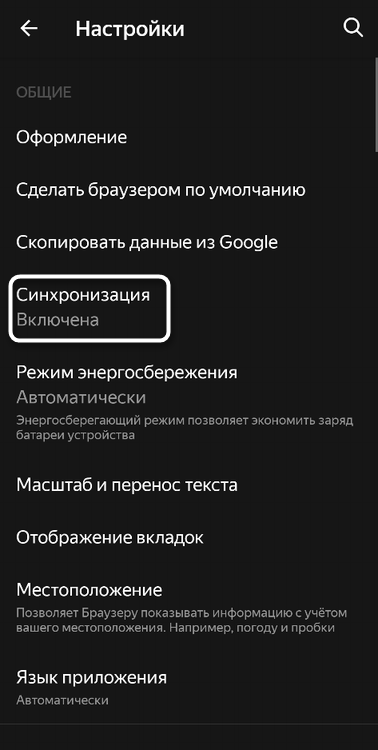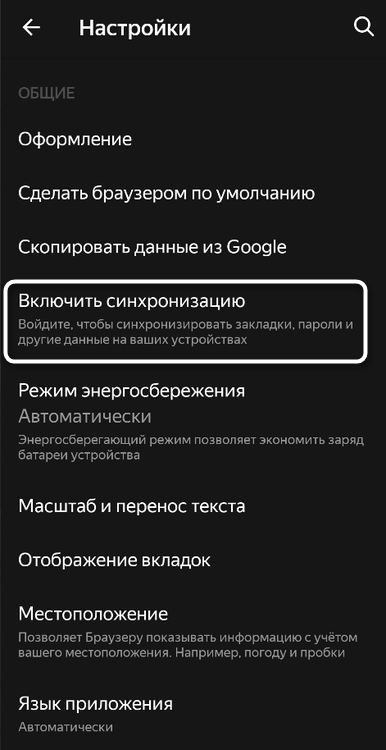 В блоке «Общие» найдите и нажмите на «Включить синхронизацию».