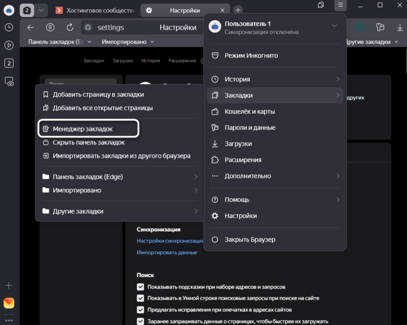 Откройте контекстное меню веб-обозревателя, щелкнув по значку с тремя полосками справа вверху. Наведите курсор на пункт «Закладки» и выберите «Менеджер закладок».