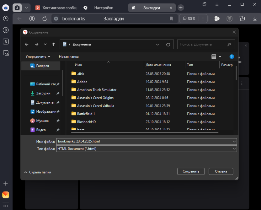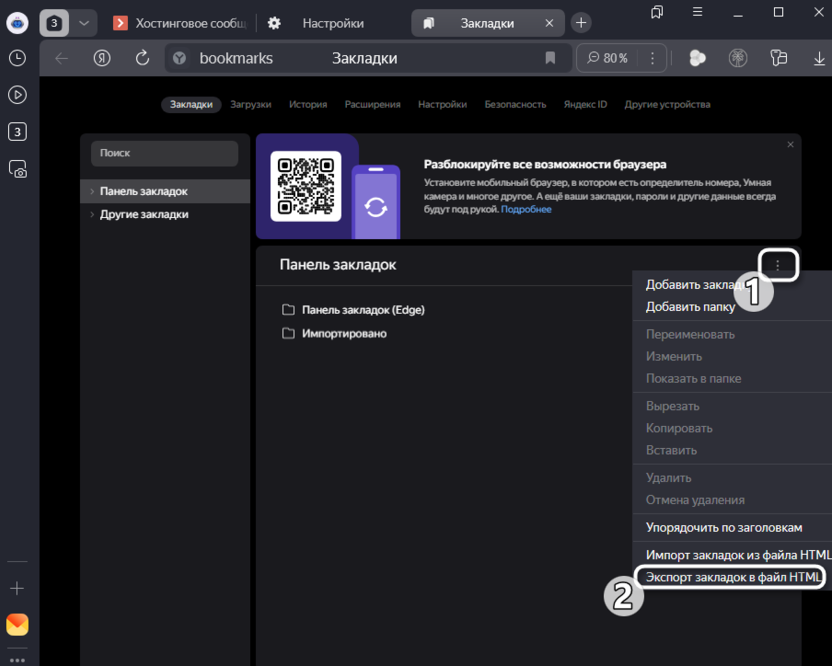 Хотя этот метод не поможет восстановить уже удаленные закладки, он может предотвратить их потерю в будущем. Регулярно экспортируйте закладки из десктопной версии Яндекс Браузера в HTML-файл: