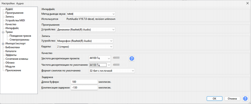 Правильные параметры задаются один раз и влияют на качество всего материала, поэтому их лучше проверить еще до первого нажатия на кнопку записи. Откройте «Правка» – «Настройки» – «Аудио» и убедитесь, что частота дискретизации проекта установлена на 44100 Гц. Это стандарт для аудиокниг, которому соответствует большинство платформ, включая Audible и все крупные агрегаторы.