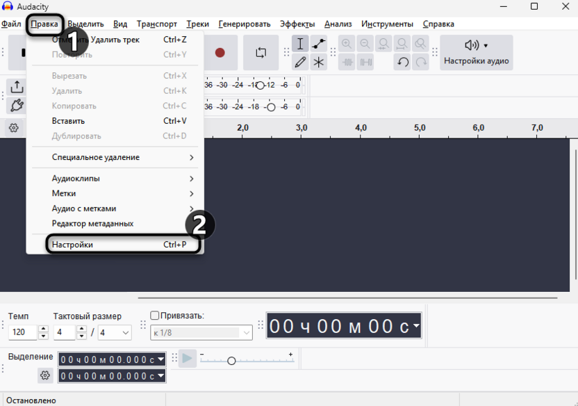 Откройте Audacity и перейдите в меню «Правка» – «Настройки» или нажмите Ctrl + P.