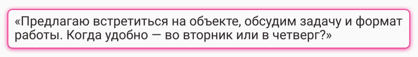 Следующий шаг – назначить встречу (желательно на объекте), чтобы зафиксировать: дату, время и адрес. Звучать это может так:
