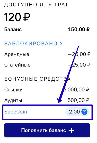 SapeCoin – это внутренняя валюта системы: баллы нельзя конвертировать в деньги или вывести. Поэтому не забывайте вовремя закупать ссылки и использовать баллы до истечения срока действия.