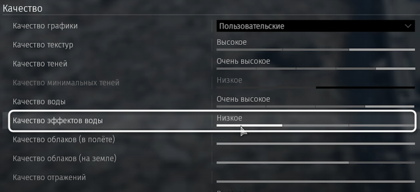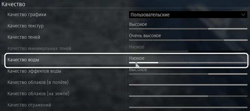 Качество воды. Включает геометрию водной поверхности, отражения и детали пены на волнах. Для танкистов и пилотов, не играющих в морских боях, этот параметр можно смело ставить на низкое качество, получив до 3% прироста FPS. Если же вы активный моряк или просто цените красивую картинку, высокое качество воды существенно улучшит визуальную составляющую морских карт. Средний вариант отключает отражения и пену, сохраняя базовую геометрию водной поверхности.