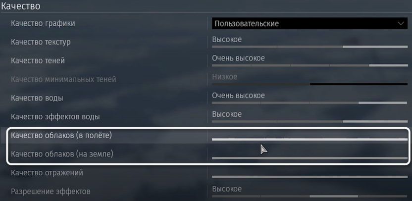 Качество облаков в полете и на земле. Параметр разделен на два ползунка – для воздушных боев и наземных. В полете каждый уровень детализации отнимает 3-4% производительности, при этом влияя на FPS даже в наземных боях. Красивые объемные облака могут мешать обнаружению самолетов, поэтому для авиации рекомендую устанавливать минимальное значение (0). Для наземных карт можно поднять до 6-8 из 12 для создания атмосферы, поскольку на танковых боях это не влияет на производительность.