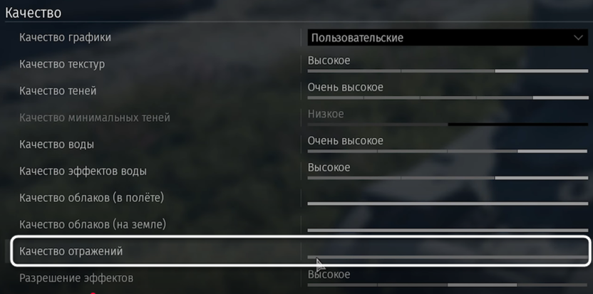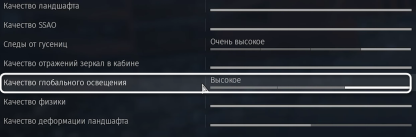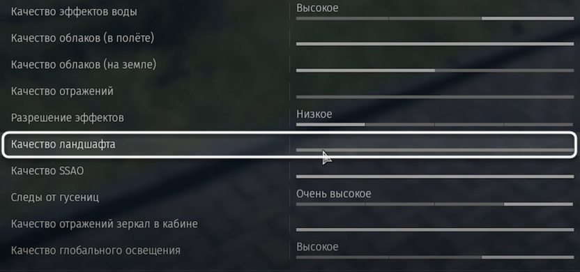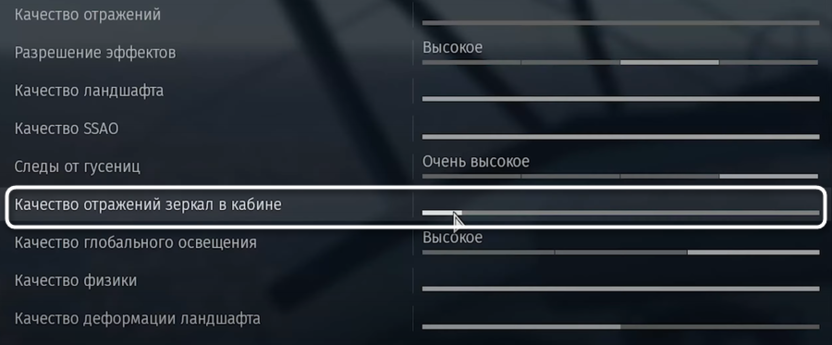 Качество зеркал в кабине. Включает отображение зеркал заднего вида в танках и их детализацию. Переход с выключенного состояния на минимальное качество отнимает около 3% производительности, дальнейшее повышение влияет меньше. Зеркала могут быть полезны для контроля тылов, особенно в реалистичных боях. Рекомендую средний уровень качества, при проблемах с FPS – полное отключение.
