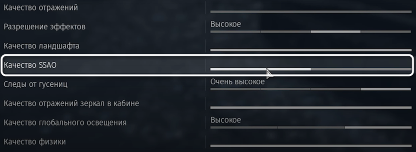 Тени от маленьких объектов. Добавляет тени от мелких деталей техники и окружения, требует активированного SSAO для работы. Влияние на производительность не превышает 1%, но может улучшить общее восприятие глубины сцены. Если у вас включен SSAO и есть запас производительности, можно поставить уровень 1-2 для более объемной картинки. На слабых системах лучше оставить отключенным.