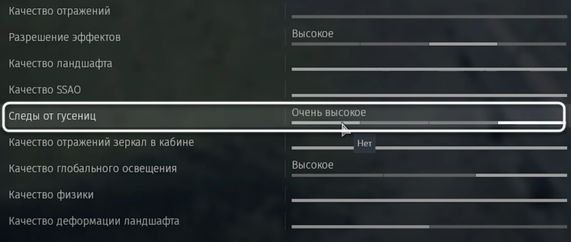 Следы от гусениц. Отвечают за отображение и детализацию следов, оставляемых гусеничной техникой на грунте. По результатам тестирования на FPS практически не влияет, но в различных боевых сценариях ситуация может отличаться. Следы могут помочь в отслеживании маршрутов противников, поэтому рекомендую среднее качество как разумный компромисс. На слабых системах можно понизить до минимума или отключить совсем.
