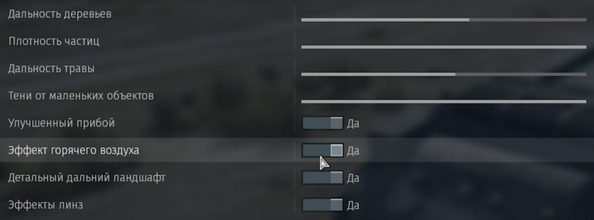 Эффект горячего воздуха. Включает визуальные искажения от нагретого воздуха возле выхлопов двигателей, стволов орудий после выстрела и других источников тепла. Результаты тестирования показывают влияние в пределах погрешности, поэтому выбор зависит от личных предпочтений. Эффект может добавлять реализма, но иногда мешает прицеливанию через нагретые поверхности. Для соревновательной игры лучше отключить.
