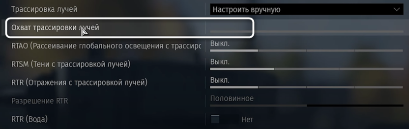 Охват трассировки лучей. Должен контролировать область применения трассировки лучей для деревьев и других объектов на различных расстояниях от камеры. По результатам тестирования влияние на визуальную составляющую и производительность не обнаружено. Возможно, эта настройка находится в стадии разработки или требует специфических условий для проявления эффекта. Рекомендую оставлять на минимальном значении.