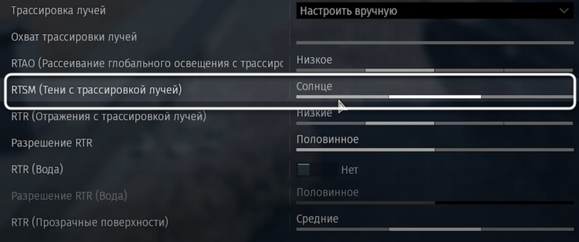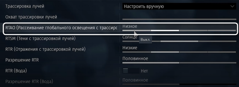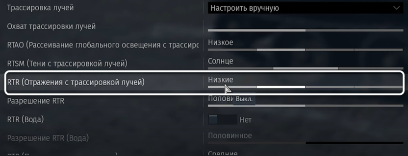RTR (Ray Traced Reflections). Трассированные отражения вместо традиционных отражений в экранном пространстве. Даже низкое качество отнимает 5-8% производительности, при этом качество рендеринга отражений оставляет желать лучшего. Отражения формируются медленно и требуют остановки для получения четкой картинки, что противоречит концепции отражений в реальном времени. Рекомендую использовать только при наличии значительного запаса производительности.