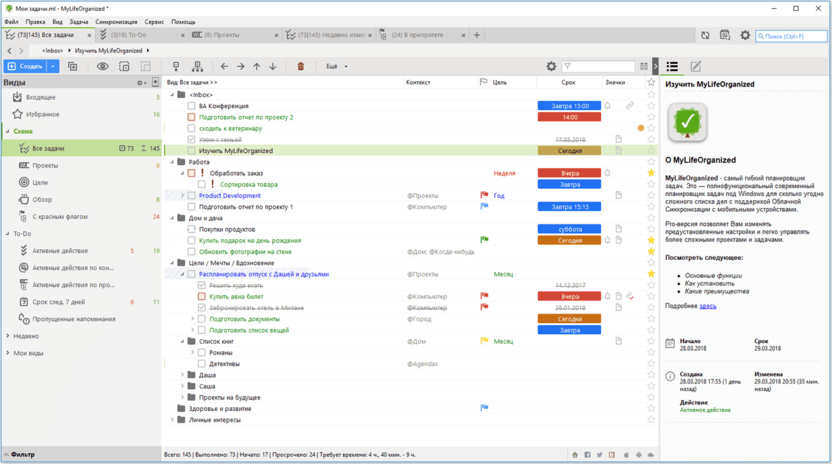 Основная фишка MyLifeOrganized – возможность создавать неограниченную вложенность подзадач с автоматическим расчетом приоритетов и зависимостей. Система умеет анализировать все ваши проекты и выдавать список следующих действий, отфильтрованных по контексту, времени и энергии. Например, если у вас есть 30 минут свободного времени и вы находитесь рядом с компьютером, MLO покажет именно те задачи, которые можно выполнить в этих условиях. Встроенные алгоритмы учитывают сложность задач, ваши предпочтения и исторические данные о производительности.
