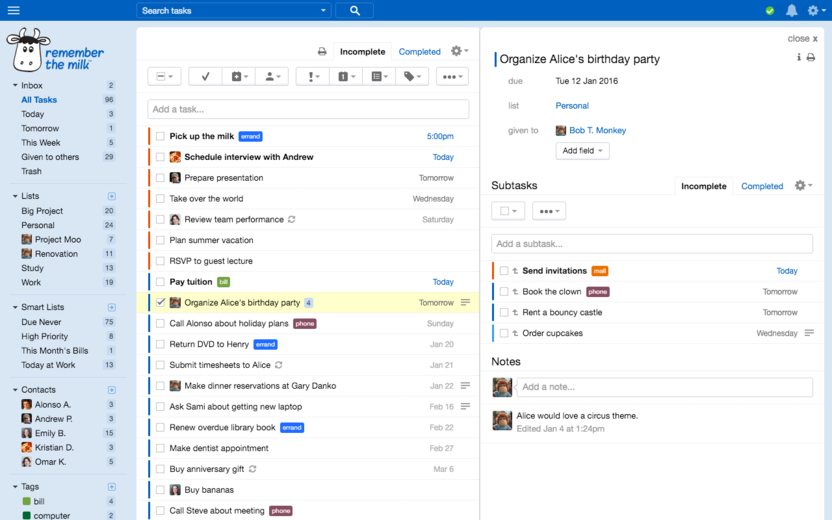 Австралийский сервис, работающий с 2004 года, является одним из старейших веб-планировщиков, который не только выжил в конкурентной борьбе, но и сохранил лояльную аудиторию. Создатели Эмили Бойд и Омар Килани построили сервис вокруг методологии Getting Things Done, но адаптировали ее для веб-среды. Remember The Milk (RTM) полностью построен вокруг концепции умных списков – динамических фильтров, которые автоматически группируют задачи по различным критериям.