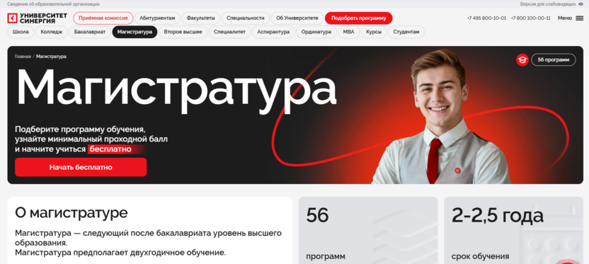 Университет «Синергия» предлагает широкий выбор программ магистратуры с возможностью обучения в дистанционном формате, что позволяет студентам совмещать учебу и основные дела. Благодаря современным образовательным технологиям, качество образования остается на высоком уровне независимо от выбранной формы обучения. Университет предоставляет различные льготы и скидки для определенных категорий граждан, а также возможности карьерного роста и трудоустройства уже на первых курсах. Кроме того, программы ориентированы на потребности современного рынка труда, что делает выпускников востребованными специалистами в своих сферах.