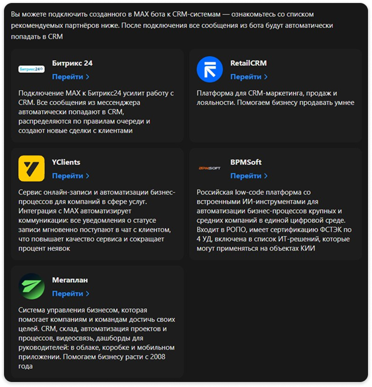 Уточните у поставщика: есть ли официальная интеграция с мессенджером MAX или подключение через сторонние протоколы. Официальная связка через API работает стабильнее и даёт больше возможностей – например, исходящие сообщения без предварительного контакта от клиента. Подключения через «серые» схемы часто ломаются после обновлений мессенджера.