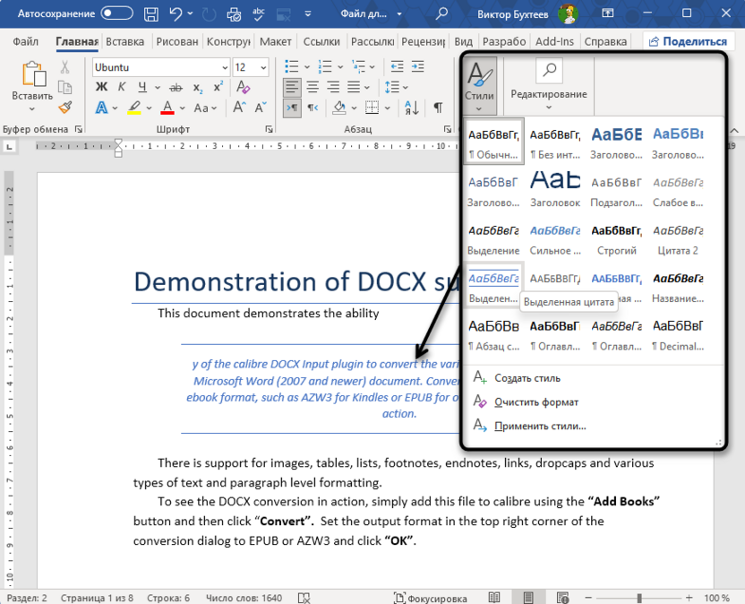 Откройте боковую панель «Стили» (стрелка в правом нижнем углу группы «Стили» на вкладке «Главная»).