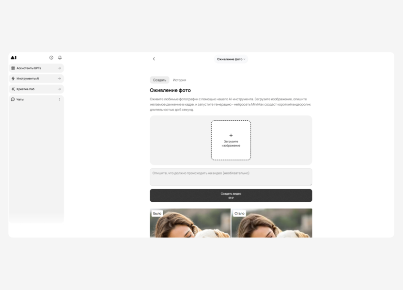 На платформе есть отдельные инструменты на базе нейросетей, которые решают разные задачи. Один из таких инструментов – «Оживление фото». Он создает анимацию на базе исходного изображения – нейросеть MiniMax создаст короткий видеоролик длительностью до 6 секунд.