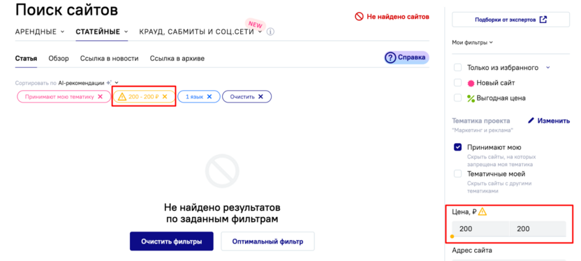 Если пользователь запрашивает условия, которым не соответствует ни один сайт в системе, например, по индексу качества домена или цене, платформа мгновенно выдает предупреждение. Рядом с проблемным полем появляется значок, и подсказка предлагает скорректировать условия.