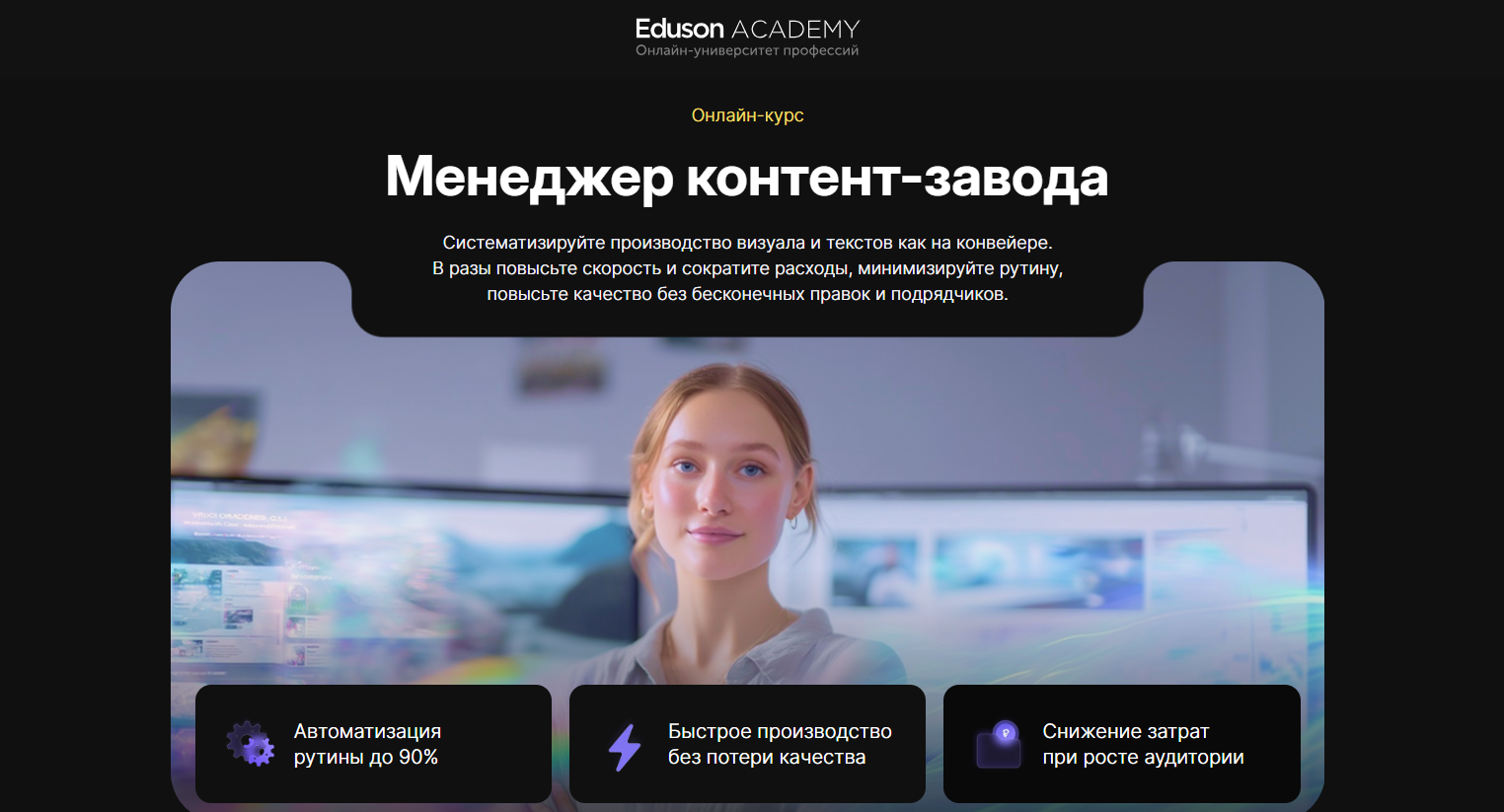 - Академия Eduson – Менеджер контент-завода: фокус на автоматизации контента, интенсивное практическое обучение, бессрочный доступ с обновлениями и поддержкой на год.