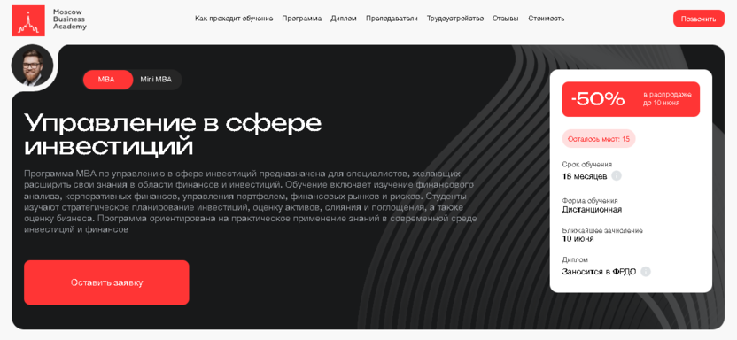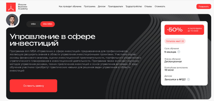- Московская Бизнес Академия (mini MBA): возможность возврата полной стоимости в течение 14 дней, диплом с международным признанием, акцент на карьерные консультации.