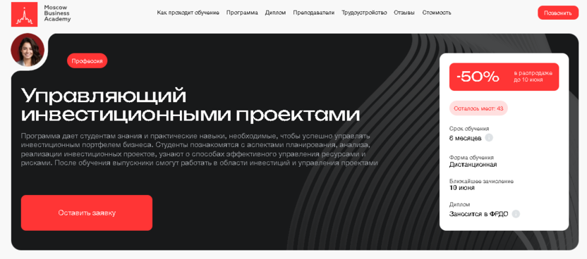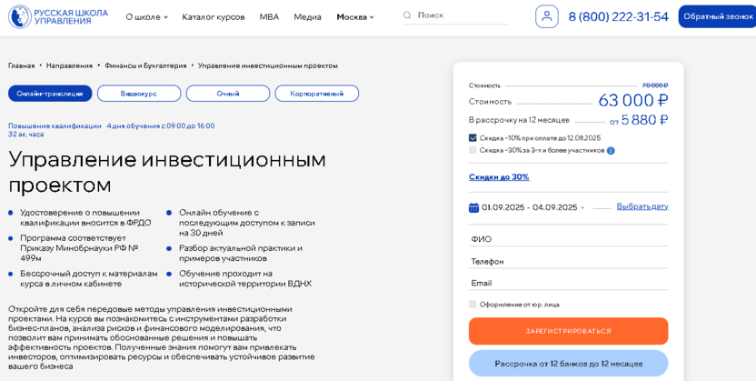 - Русская Школа Управления (Управляющий инвестиционным проектом): акцент на разработку инвестиционных тизеров и конкурентных стратегий, бессрочный доступ к материалам и гибкий график.