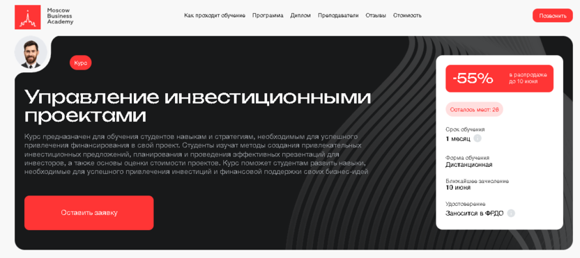 - Московская Бизнес Академия (курс 1 мес): ускоренная программа за 1 месяц, удостоверение государственного образца, упор на разработку инвестиционных предложений.