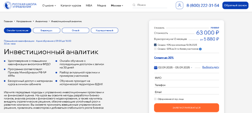 - Русская Школа Управления (Инвестиционный аналитик): 70% практики за 4 дня обучения, бессрочный доступ к материалам, удостоверение гособразца с семью степенями защиты.