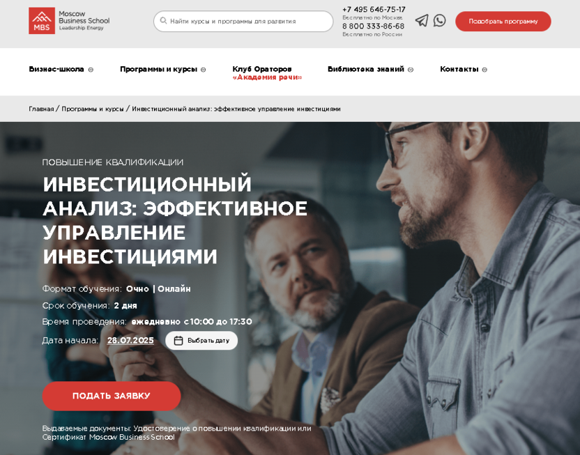 - Moscow Business School: обучение за 2 дня с очным или онлайн-участием, доступ к закрытому бизнес-клубу, акцент на расчет ставки дисконтирования.