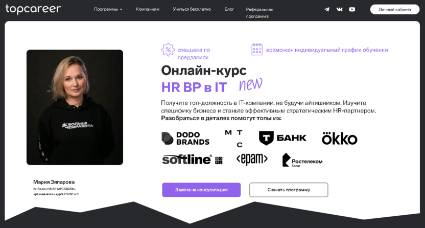 - TopCareer: удостоверение о повышении квалификации, экскурсии в IT-компании, личный куратор, обучение с фокусом на HR-стратегию и продуктовый подход.