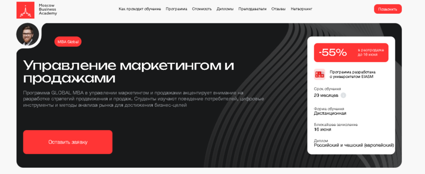 - Московская Бизнес Академия (MBA Global): два диплома (российский и европейский), стратегические сессии в Москва-Сити, акцент на нейромаркетинг и международные кейсы.