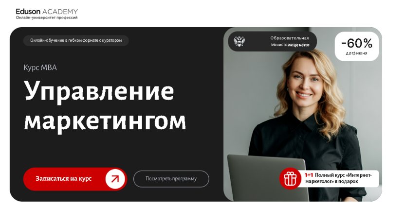 - Eduson Academy (MBA, маркетинг): индивидуальный темп, круглосуточный доступ, сопровождение куратора, диплом по лицензии Минобрнауки РФ.