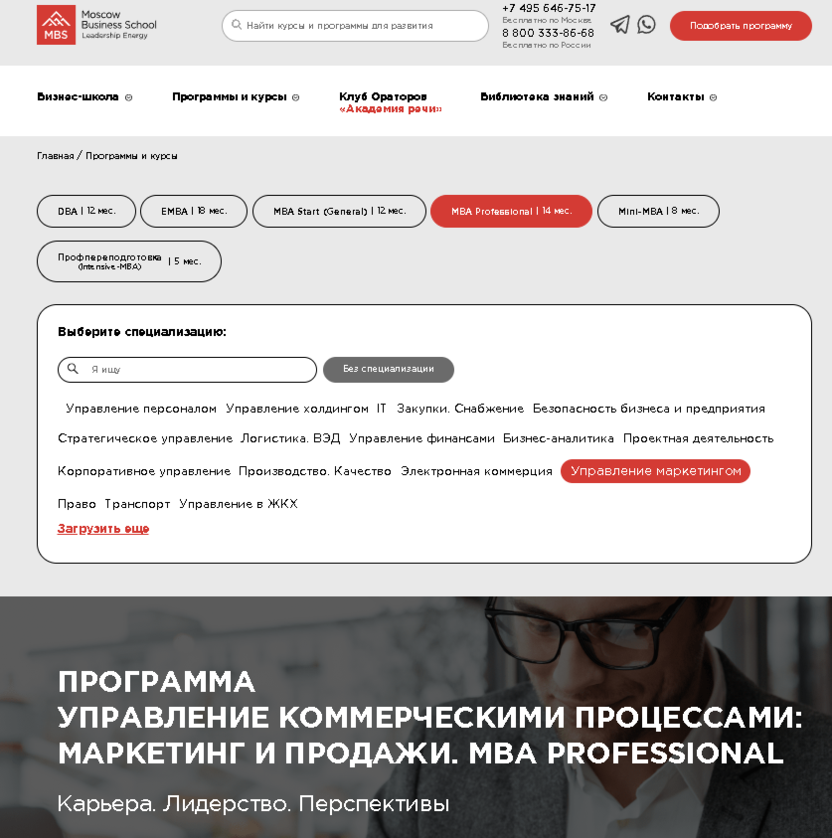 - Управление коммерческими процессами: маркетинг и продажи, MBA – Moscow Business School
