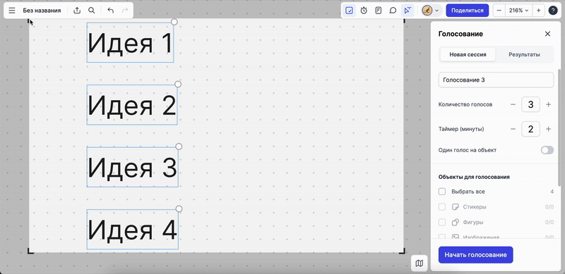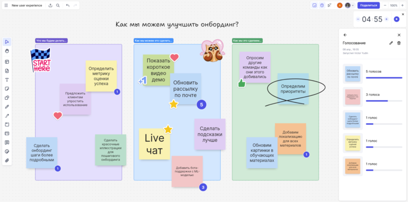 Голосование. Инструмент позволяет участникам доски анонимно или открыто выбрать идеи, решения или задачи, просто кликнув по нужному элементу. Это делает процесс принятия решений демократичным и быстрым.