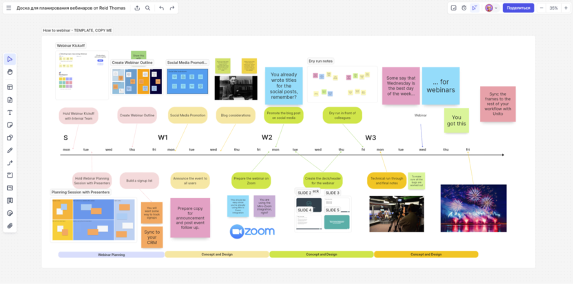 Коммуникация: стикеры, эмодзи, заметки и комментарии. Их можно использовать для обсуждения, вовлечения и обратной связи прямо на доске в режиме реального времени. Все это дает возможность максимально эффективно использовать доску для совместной работы.