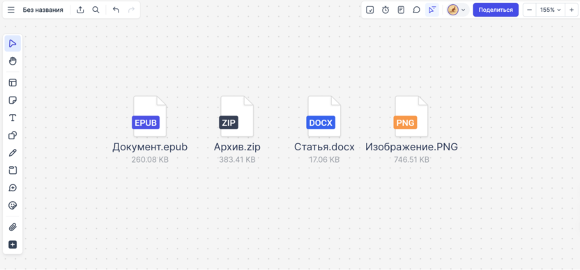 Документы и загрузка файлов. Можно прикреплять PDF, изображения, видео, ссылки и другие документы прямо к доске.