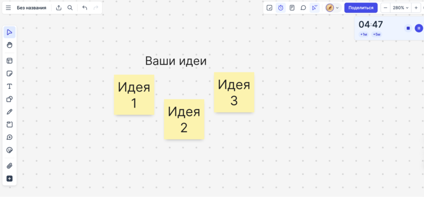 Пример: на онлайн-уроке преподаватель делит студентов на мини-группы и дает им 5 минут на генерацию идей по улучшению школьной жизни. Включает таймер – участники видят, сколько времени осталось, и действуют активнее. Когда таймер срабатывает, все возвращаются к общей доске для презентации своих идей.