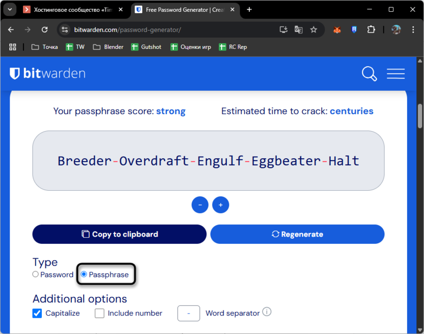 Bitwarden выделяется среди конкурентов поддержкой парольных фраз (passphrases) – альтернативного подхода к созданию запоминающихся, но стойких паролей. Вместо хаотичных символов система может генерировать последовательности из случайных слов типа «correct-horse-battery-staple», которые легче запомнить, но не менее защищены от взлома.