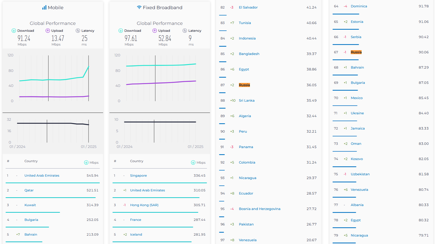 В рейтинге регулярно обновляются сведения по средней глобальной скорости соединения. По итогу, зафиксирован рост этого показателя практически в два раза – с 56,43 Мбит/с в июле 2024, до 91,24 Мбит/с в начале 2025 года.