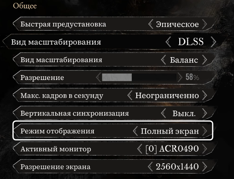 Режим отображения. Полноэкранный режим обеспечит максимальную производительность, так как позволяет игре получить эксклюзивный доступ к ресурсам графического процессора. Оконный режим или полноэкранный без рамки могут вызывать дополнительные задержки и снижение FPS.