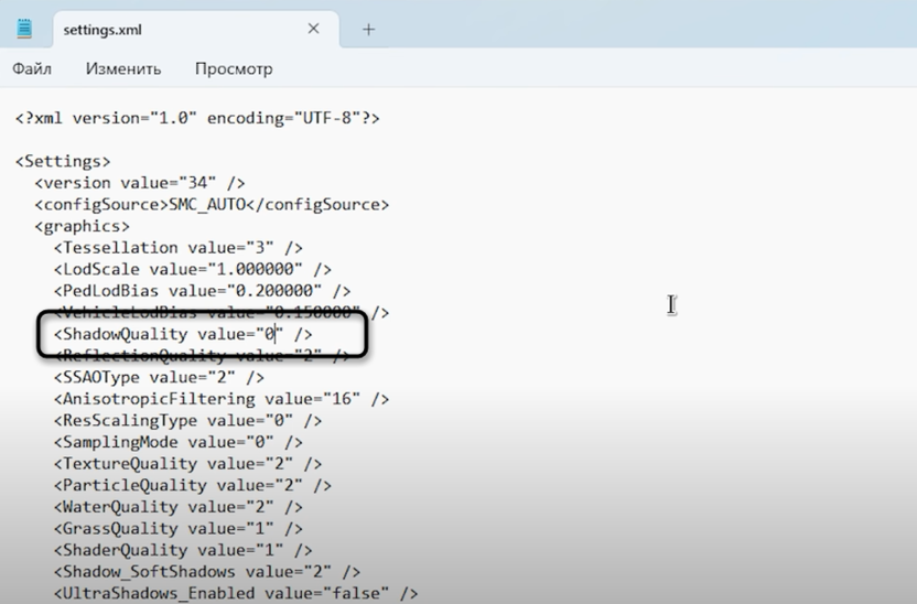 В самом начале файла найдите параметр Shadow Quality и измените его значение на 0.