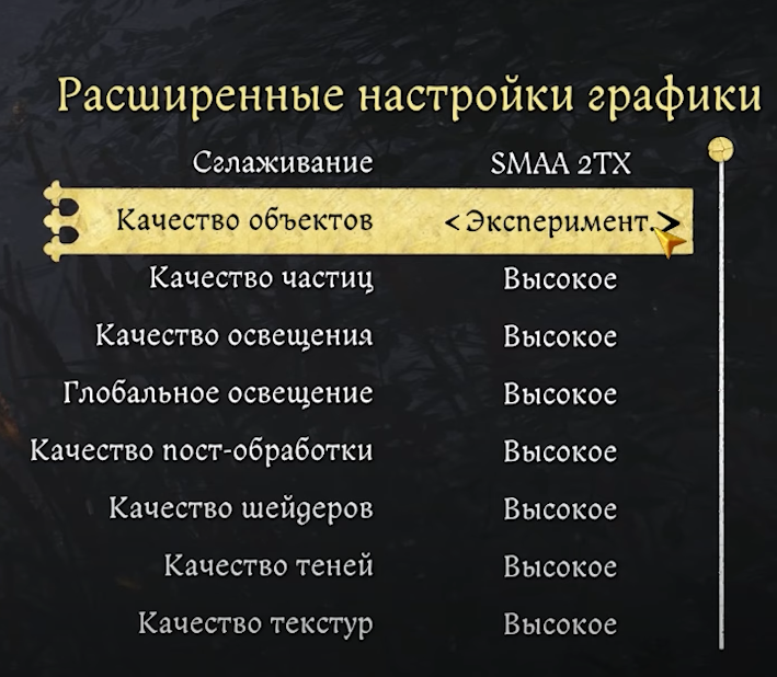 Для оптимального баланса между качеством и производительностью я рекомендую использовать высокое качество объектов. Эта настройка дает заметное визуальное улучшение по сравнению со средним и низким, но при этом экономит ресурсы по сравнению с «ультра». Если у вас слабый процессор, стоит выбрать среднее качество. Экспериментальный параметр обеспечивает лишь небольшое улучшение LOD и не стоит дополнительной потери производительности.