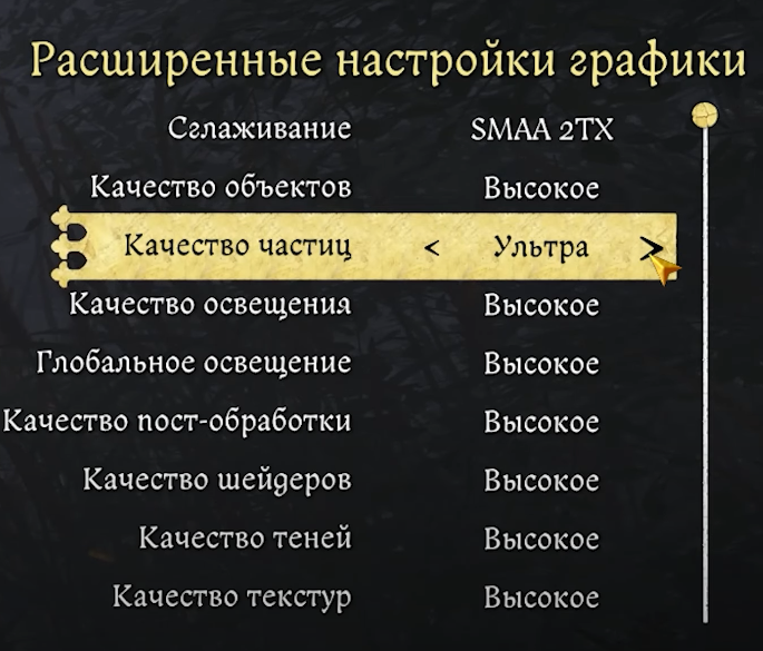 Данный параметр имеет ограниченное влияние в игре и задействуется только в определенных сценах. Например, при взгляде на некоторые печи с низким качеством частиц устраняется эффект дымки. В большинстве локаций количество частиц настолько мало, что визуальной разницы между настройками практически не заметно. Более того, эта настройка оказывает минимальное влияние на производительность.