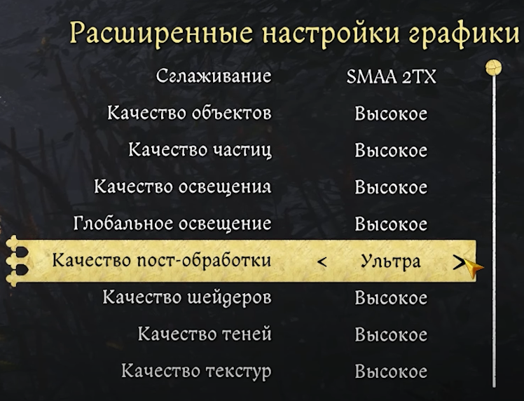 Данный параметр отвечает за различные эффекты постобработки и эффекты камеры, включая размытие в движении, размытие объектов, глубину резкости и блум. Большинство этих эффектов оказывают минимальное влияние на производительность, но могут значительно влиять на визуальное восприятие игры.