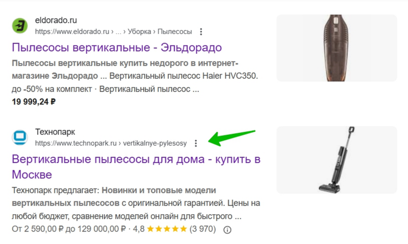 Сравните со сниппетом сайта, у которого URL не оптимизирован и микроразметка не внедрена: