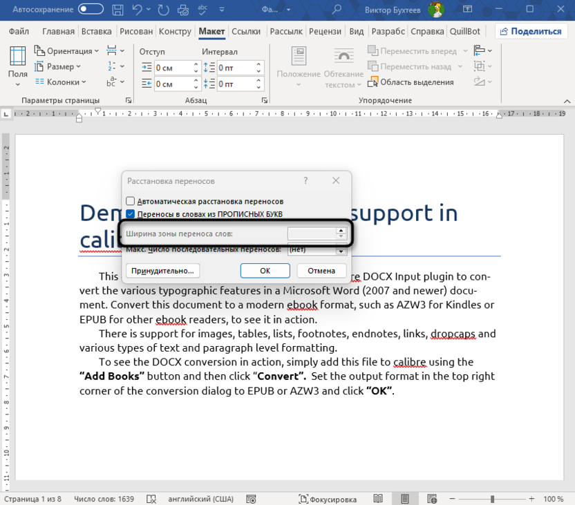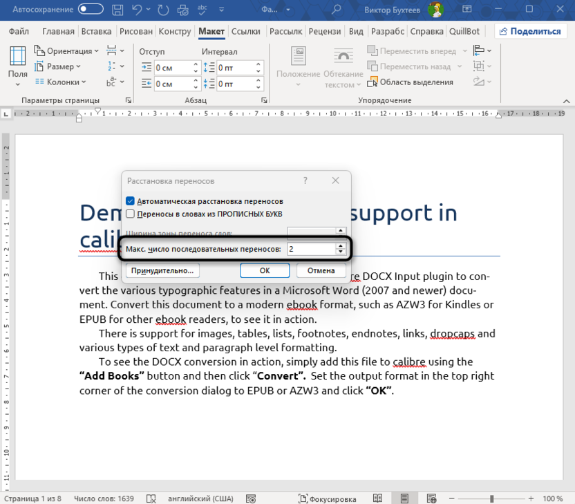 Для точной настройки откройте «Параметры расстановки переносов» в том же меню. Установите ширину зоны переноса (обычно 0,25-0,63 см) и ограничьте количество идущих подряд переносов.