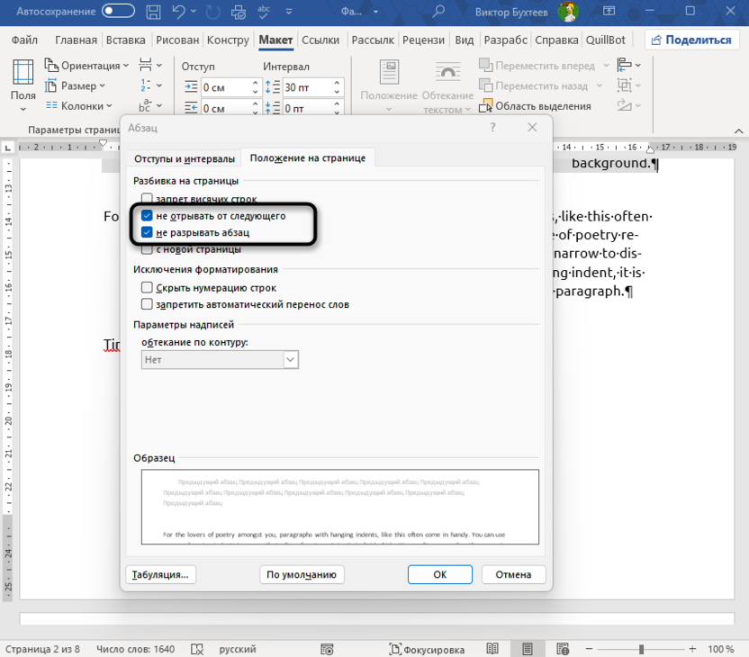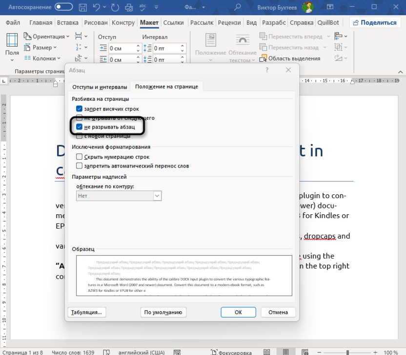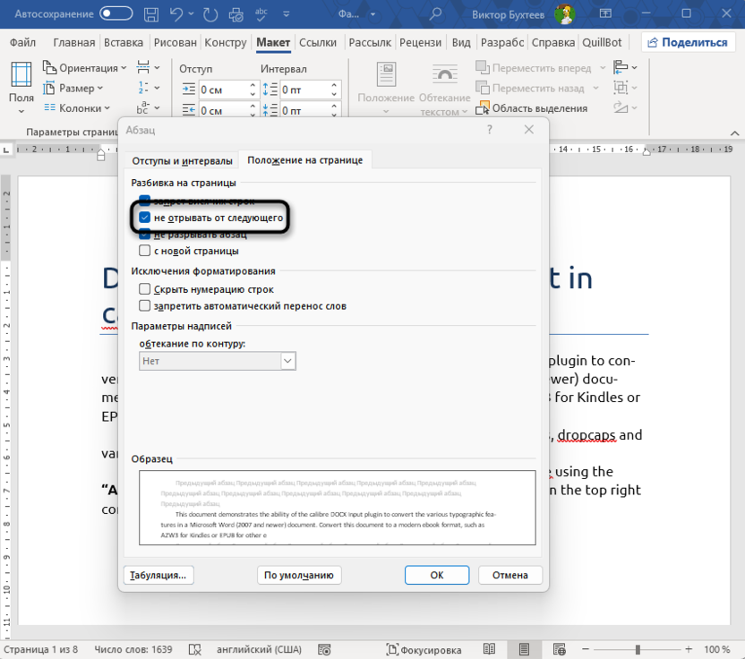 Функция «Не отрывать от следующего» обеспечивает, что текущий абзац всегда останется на одной странице со следующим. Настройка незаменима для заголовков, которые не должны отрываться от основного текста, и для абзацев, логически связанных с последующим содержимым.