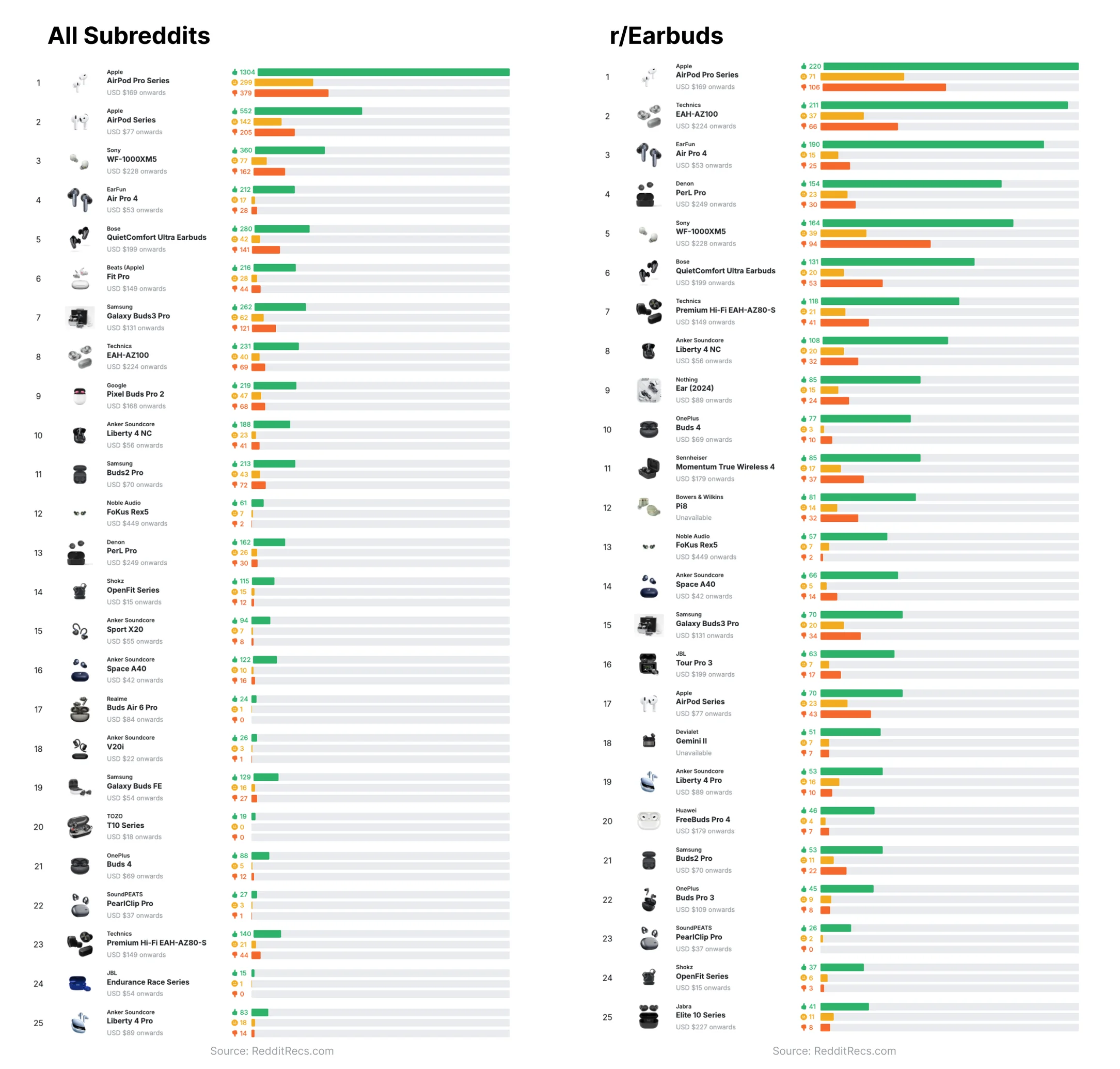 Результаты пользователь опубликовал на платформе RedditRecs, вдобавок он представил две таблицы. Одна отражает распределение комментариев на Reddit, а другая касается только профильного сабреддита r/Earbuds.