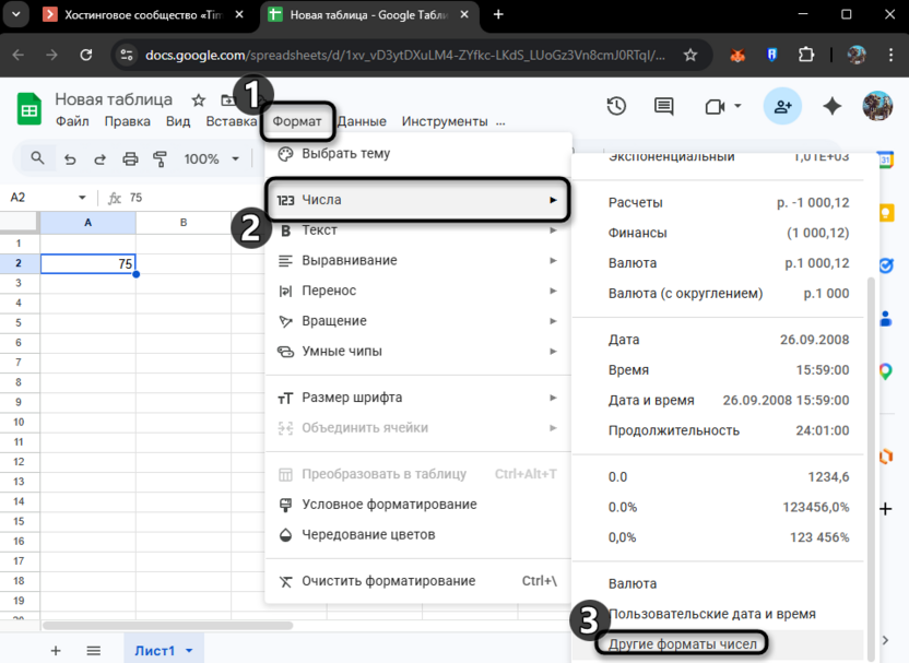 Выделите ячейку или диапазон, которому нужно задать формат, затем пройдите по пути «Формат» – «Числа» – «Другие форматы чисел».